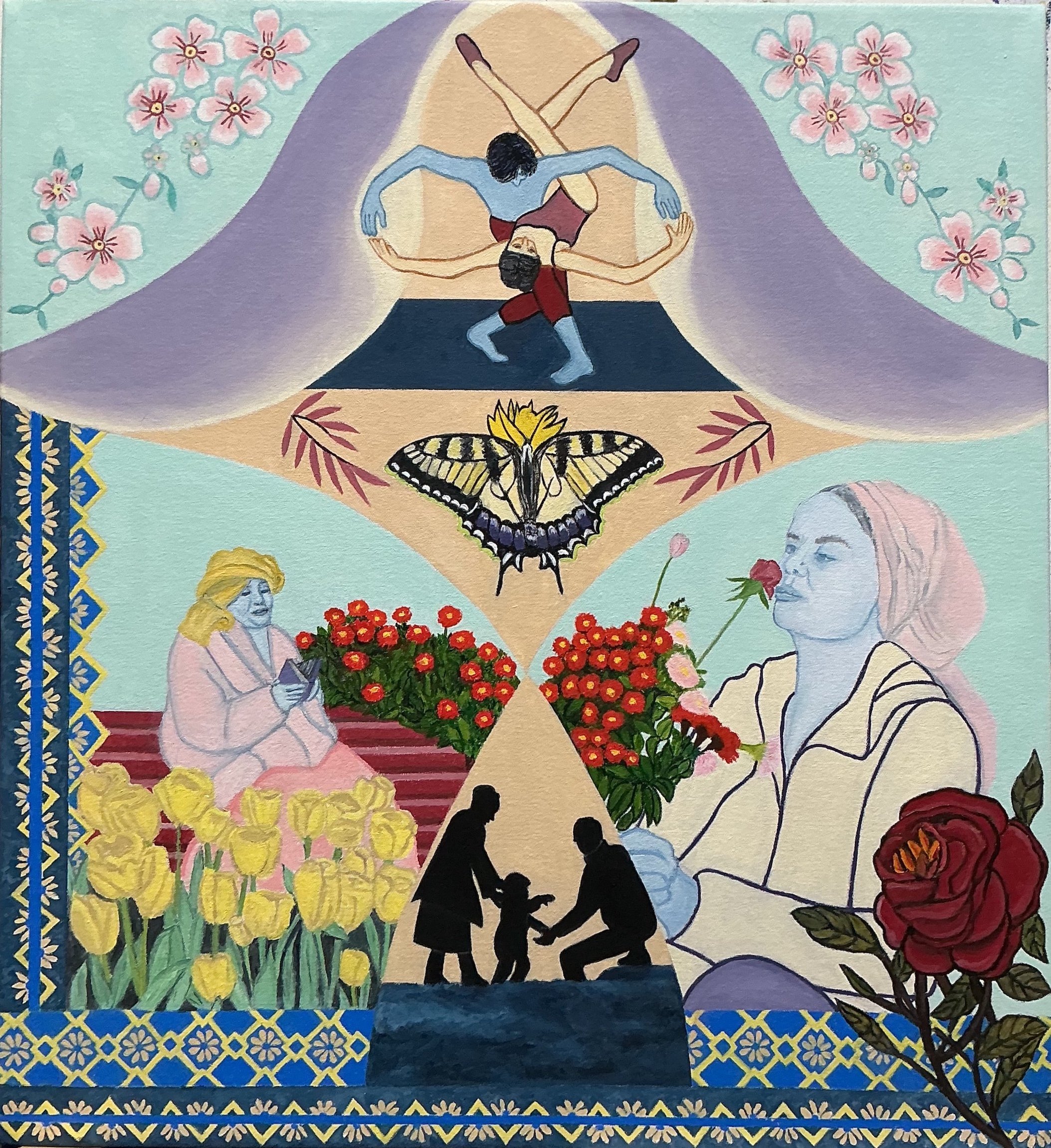 This awakened in me the need to follow their example by basing a series of paintings on my own contemporary world. To emphasize this connection between my art and the ancients, I use simple tools that relate to the sticks and ash of the past. i.e., oil paint, made from raw pigments, and brushes resembling sticks. No digital or AI for me! So, in this painting series, figures and elements are all drawn from our contemporary world. They’re anonymous and suggestive rather than narrative, allowing for a free interpretation in order to present a poetic vision. Abstract but figurative, catching the moment but embodying universality, a homage to the semi-abstract paintings in the early caves.